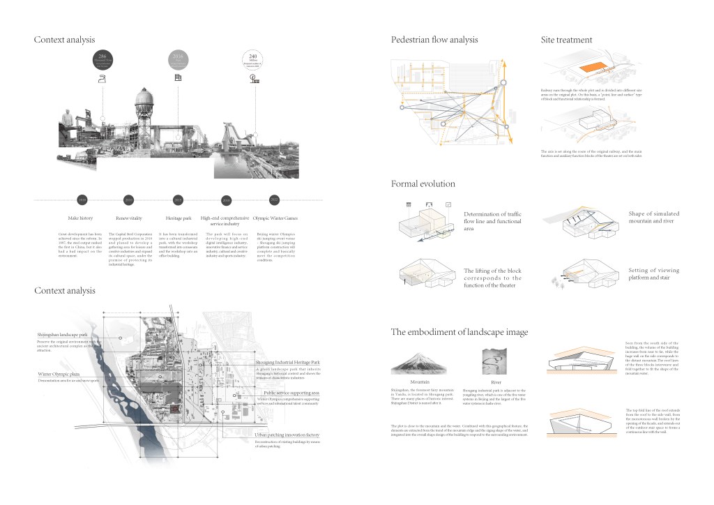 Following the shutdown of Shougang’s industrial operations, the site is being transformed into a hub for leisure and creative industries, and served as the venue for the ski jumping competition during the Winter Olympic Games. The proposed theater is located within Shougang Industrial Park, positioned at a railway intersection with an open water surface to the north.