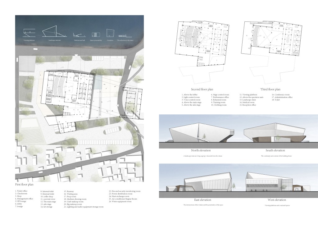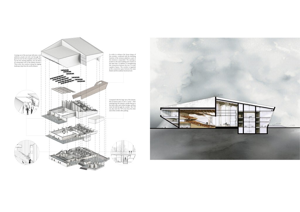 The overall spatial composition plays with rhythm and contrast—alternating between solid and void—to create a dynamic visual experience. Outdoor spaces are defined through enclosed volumes and semi-open “gray spaces” beneath cantilevered structures. Inside, careful attention to sightlines is expressed through the use of a suspended grid and elevated viewing platforms, enhancing both the spatial depth and the audience’s sensory engagement.