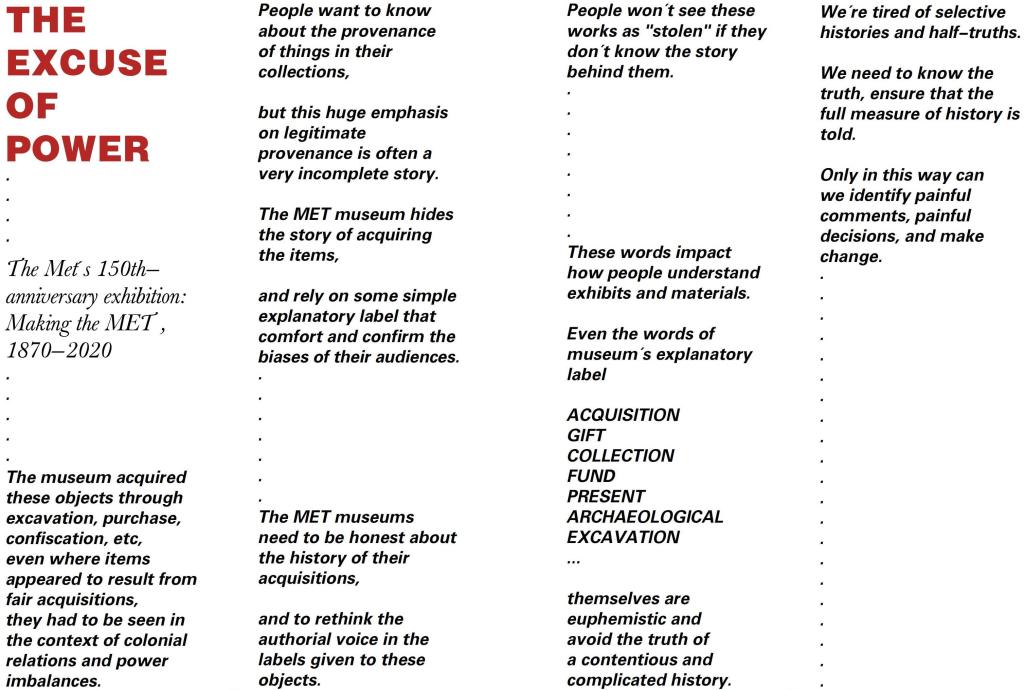 Traditionally, museums have been idealized as neutral spaces of preservation and education—places where the public passively consumes a tidy, complete narrative of human history. But this notion ignores the violent, hierarchical structures that shape historical narratives. Every object in a museum is embedded in a power dynamic; none are truly “free.” Institutions like The Metropolitan Museum of Art reflect a colonial and imperial impulse: the desire to categorize, contain, and aestheticize the world in a single building, stripped from context and sanitized for display.