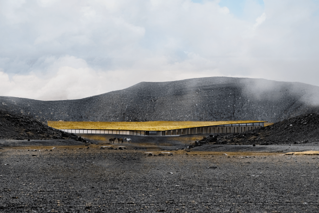 Our proposal integrates seamlessly with the natural environment by extending the elegant curvature of the volcano into the building’s design. The structure features a folded green roof that echoes the surrounding mountain silhouettes. The roof’s height varies based on programmatic needs and transitions into a publicly accessible observation deck, offering panoramic views of the volcano. This green roof pays homage to Norwegian vernacular architecture and, when viewed from above, resembles a green leaf that invites visitors to pass through and experience the scenery beyond.