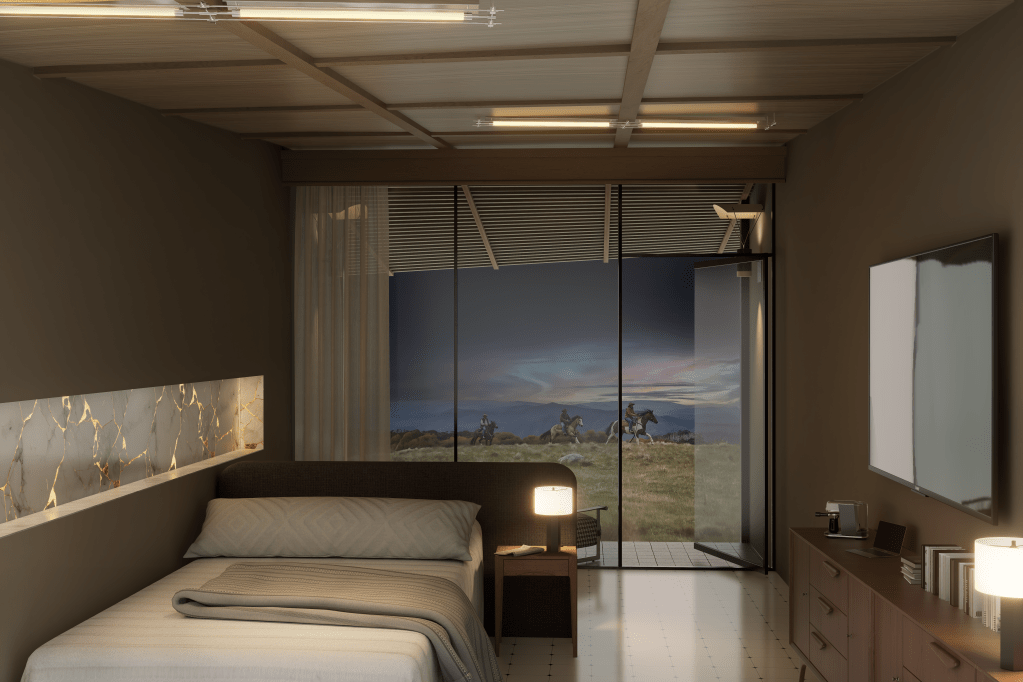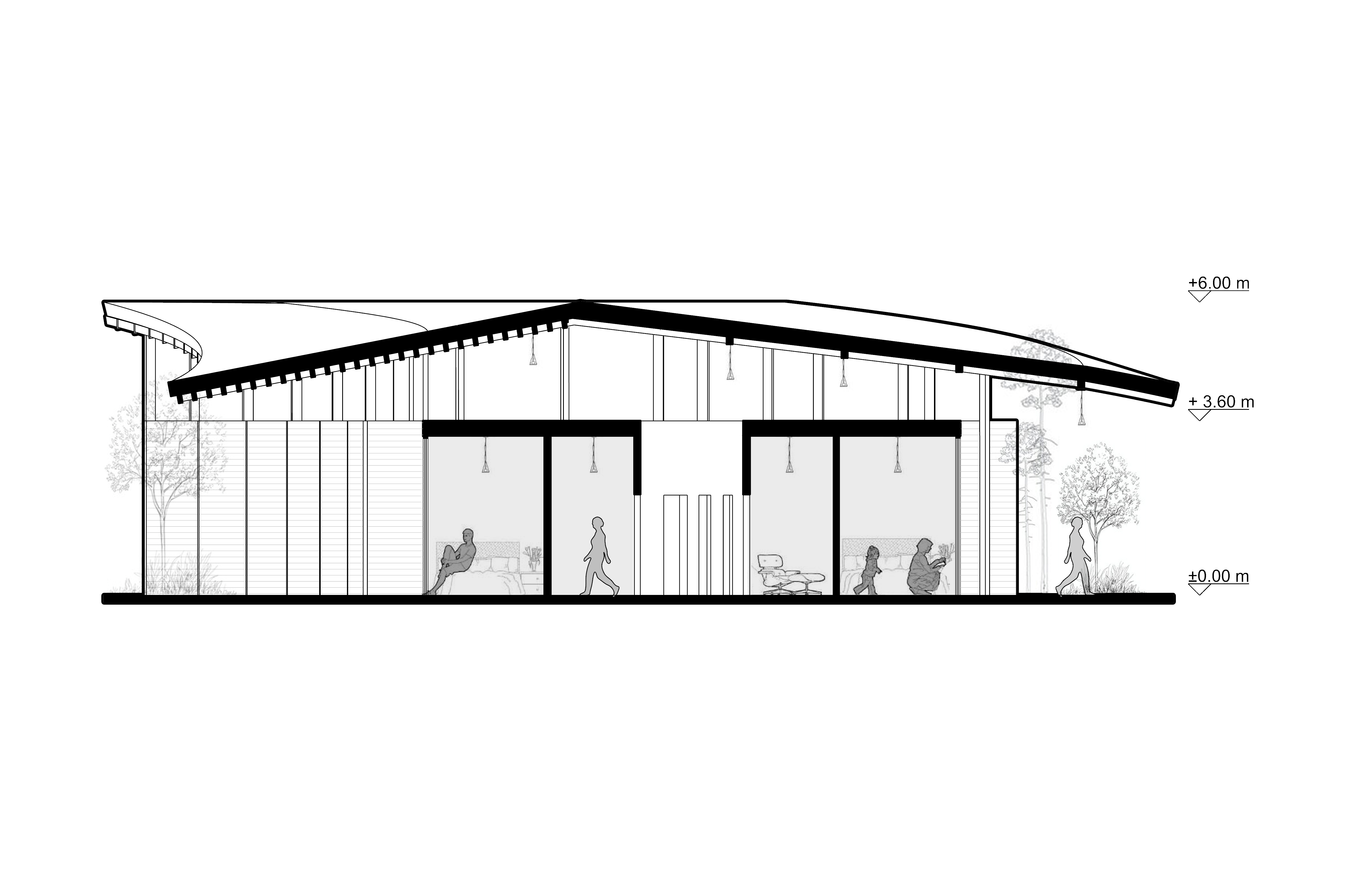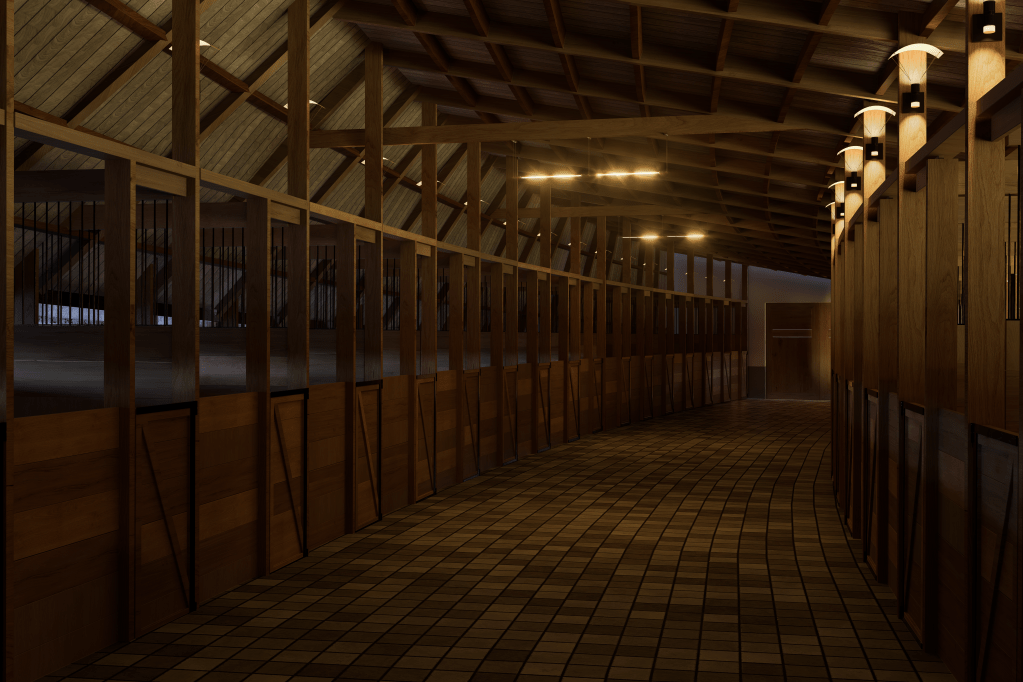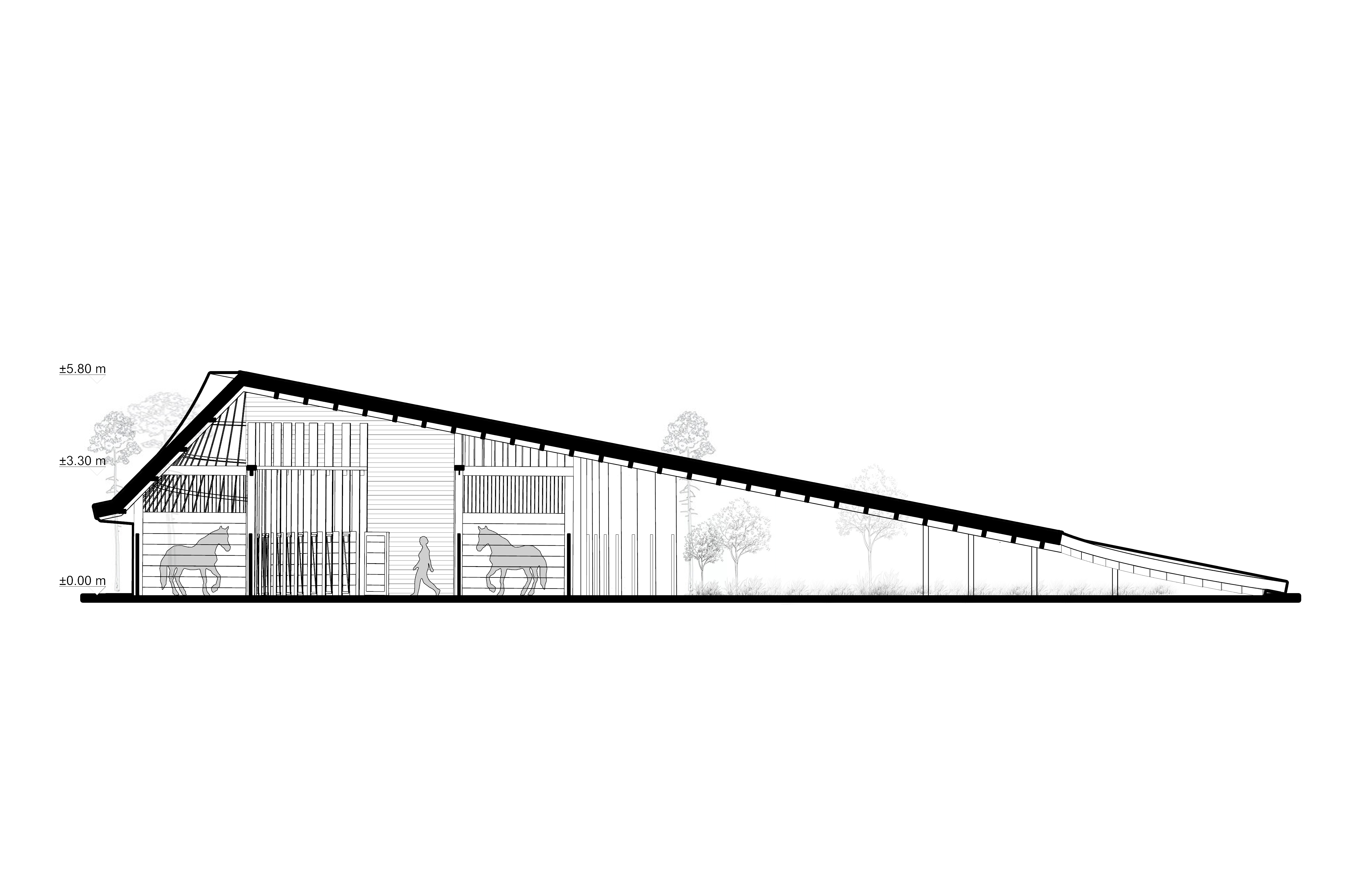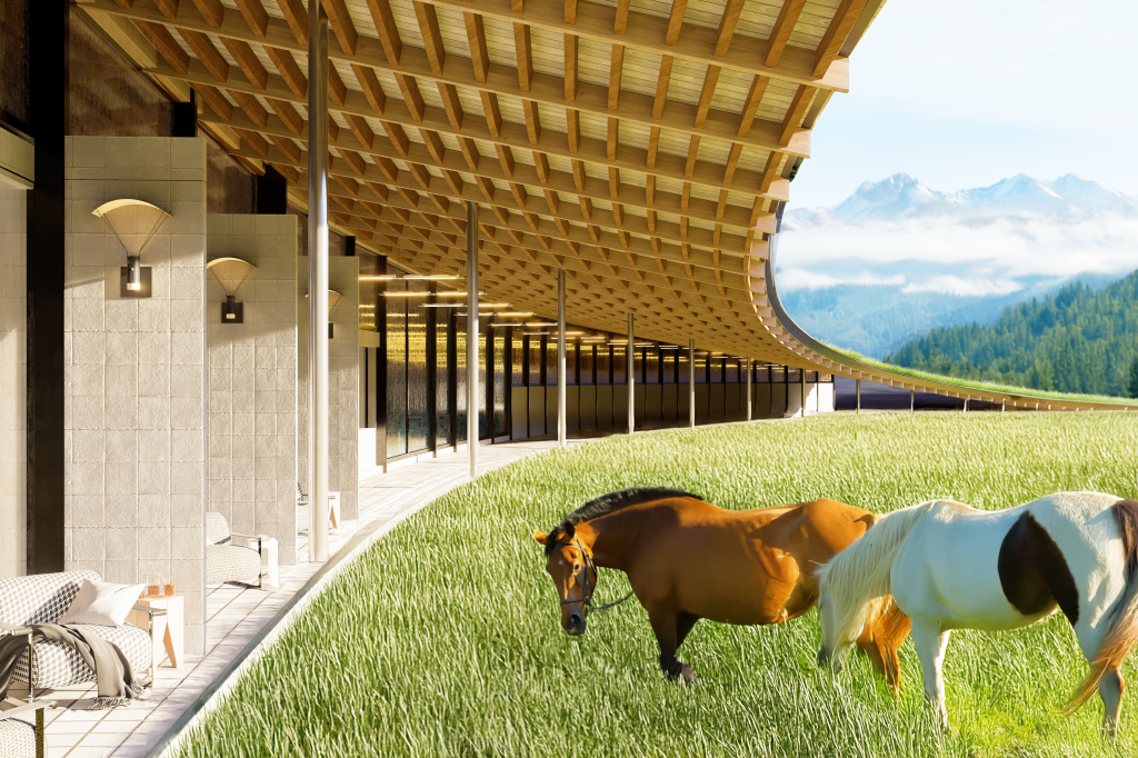 The stables feature 50 modular units for horses, with a curved form and pitched roof that guide the eye toward the picturesque horizon. The repetitive timber units ensure cost-effective construction. The transparent glazed façade minimizes the building’s visual impact, while the gentle roof structure blurs the boundary between interior and exterior, making the building feel like a natural extension of the beautiful landscape.