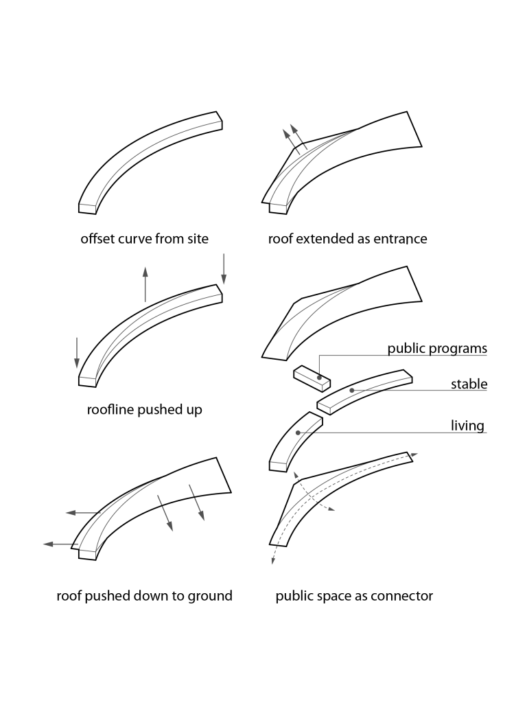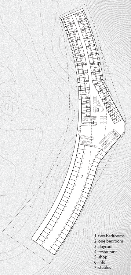 The building is organized into three zones: visitor lodging, stables, and a central area housing public programs such as restaurant, retail, and children’s spaces. The public area extends the existing mountain path, creating a threshold that divides yet connects the path ascending the mountain and the volcano pit. Visitors can pass through the public zone without disturbing activities in the lodging or stables.