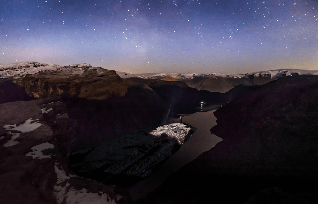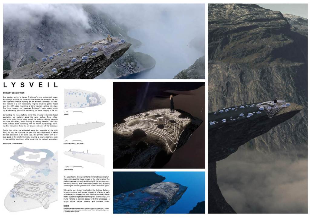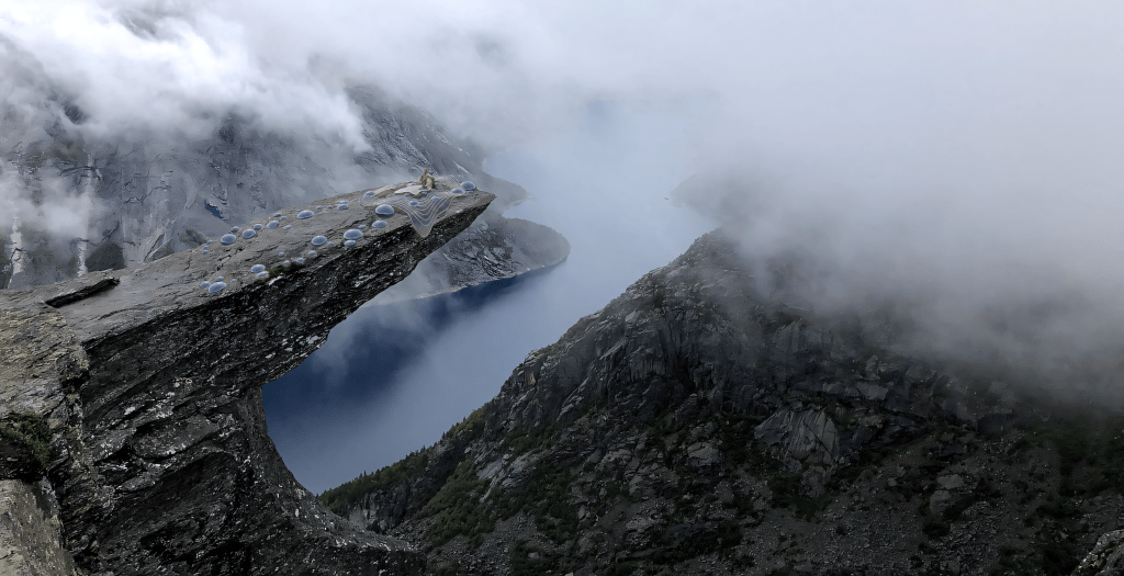 Our design seeks to honor Trolltunga’s raw, untouched beauty through a subtle and immersive intervention that enhances the visitor experience without imposing on the dramatic landscape. The central element is a semi-transparent, ring-like structure, gently draped over the cliff’s edge, resembling a fabric naturally settling into place. This form respects and preserves Trolltunga’s iconic shape, creating a safe resting point while maintaining the visual integrity of the site.