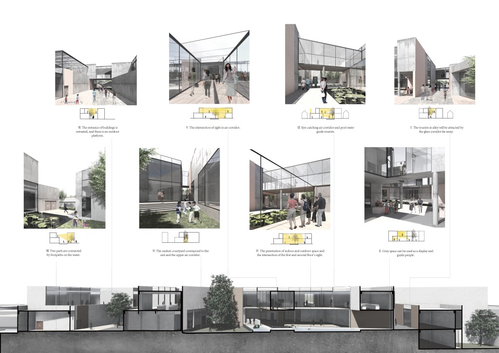 The spatial organization connects exhibition halls through elevated air corridors that frame visual connections and enhance spatial fluidity. A transparent glass box overhangs the entrance, creating a semi-open plaza beneath that serves as a performance space—inviting passersby and guiding visitors inward. Externally, a circulation path weaves through the adjacent Chaodou Hutong and Banchang Hutong, where audio-visual exhibitions activate the urban fabric and extend the museum experience into the neighborhood.